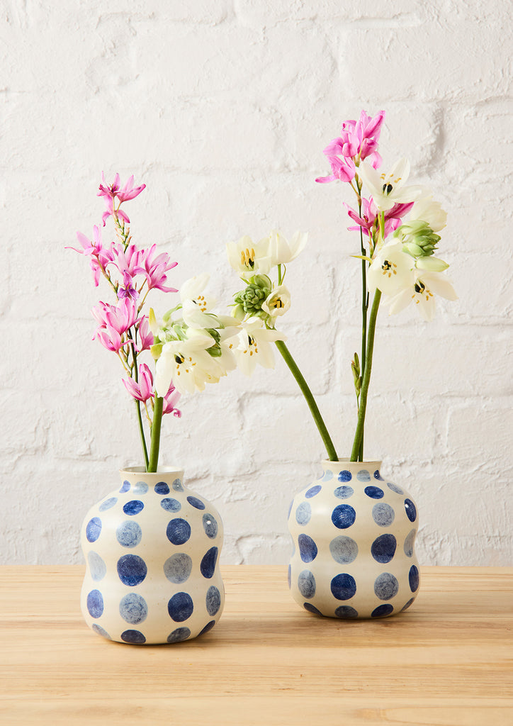 The Angus & Celeste Bushland Spot Bud Vases are a joyful celebration of colour, form, and texture. Bands of hand-applied dotty patterns dance playfully around each vase’s soft, rounded belly, creating a lively contrast that feels both organic and modern.