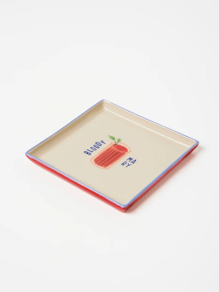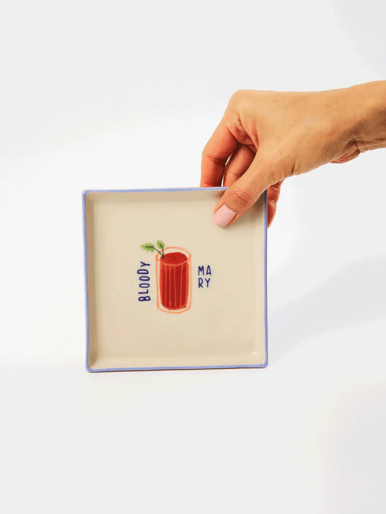 This one's for the brunch lovers. The Happy Hour Mary dish is just the right size for celery sticks, olives or little snacks. With its hand-painted design and sky blue contrasting trim, it makes even a snack plate feel like a little party celebration.