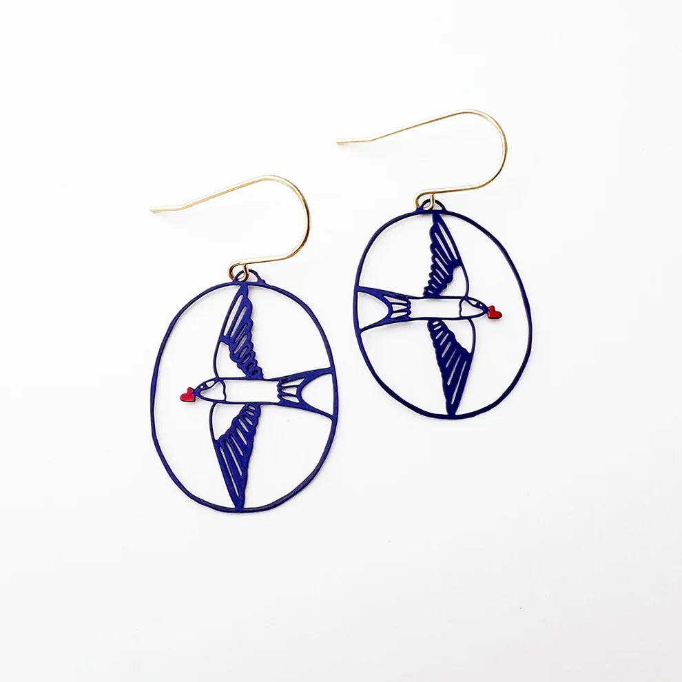 Midi Love Swallow earrings in Blue/Red. Super lightweight.