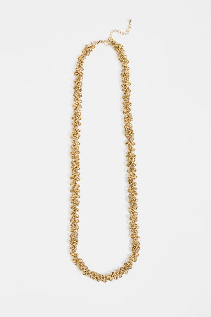 The Hava Necklace is a stunning, lightweight design comprised of multiple, metallic jump rings connected together in a layered fashion to form a textured thick chain. The long length and unique design can be worn at full length or double wrapped for a shorter-style necklace.