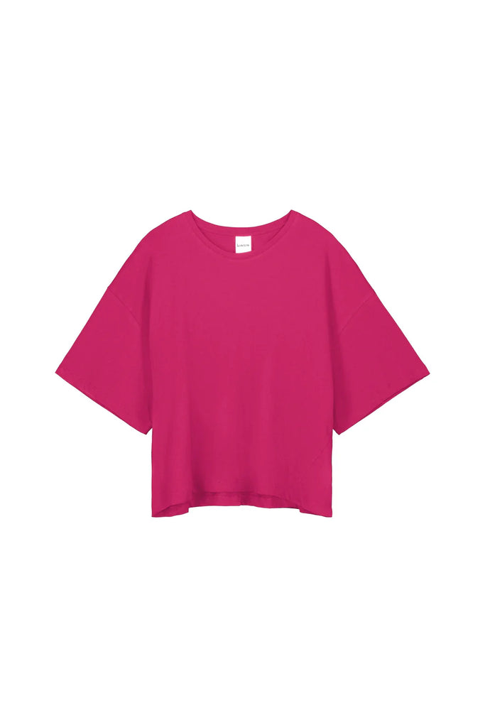 The Light Boxy Tee offers a relaxed fit with a drop shoulder silhouette. It features a classic crew neckline and is detailed with our signature twisted side seams. Crafted from a lightweight organic cotton jersey in a vibrant Magenta. All Fairtrade organic cotton. All plastic-free.