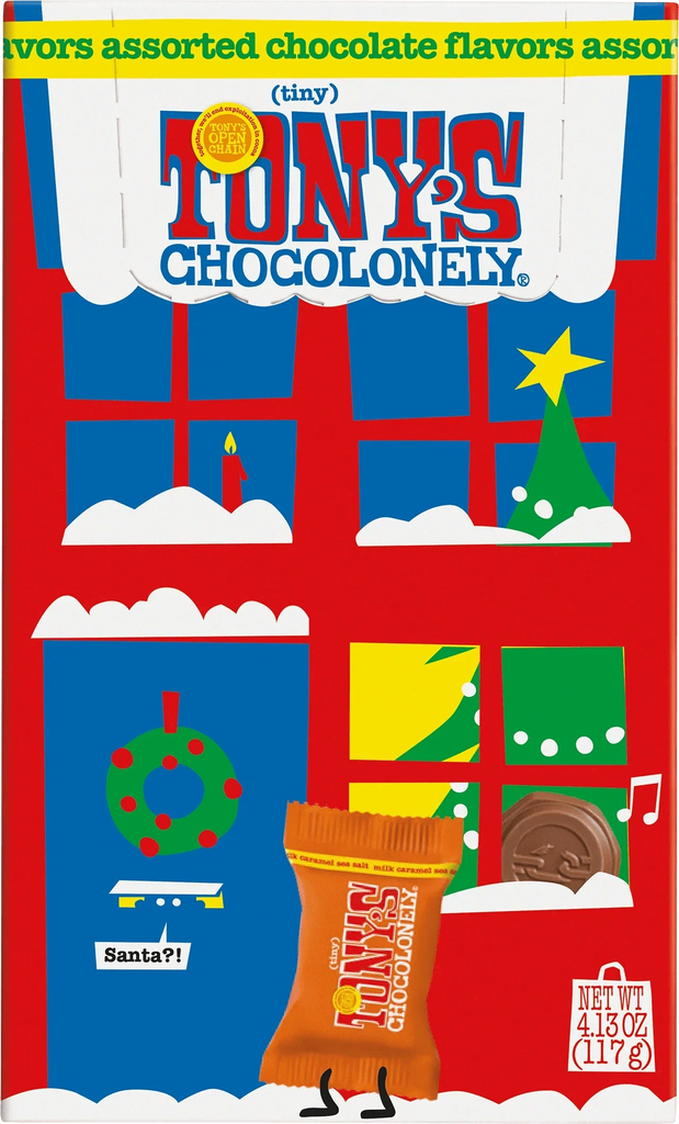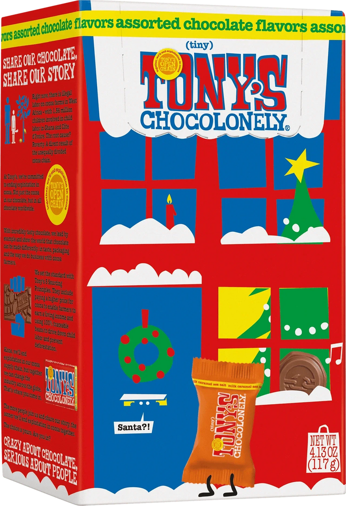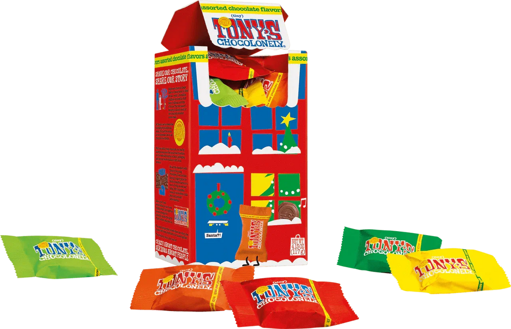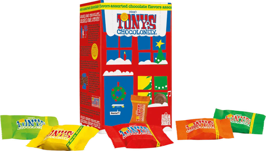 They say good things come in small packages. And here's the proof! Tiny Tony's are the perfect gift you've been looking for. Made using 100% traceable coco and 100% ready for snacking + sharing. Hand them out, enjoy them with friends or keep them all for your next movie night. Now available in a cozy gift box just in time for the holiday season! This box contains 13 individually wrapped Tiny Tonys in Milk Chocolate, Milk Caramel Sea Salt, Milk Chocolate Hazelnut, Dark Chocolate and Dark Almond Sea Salt.